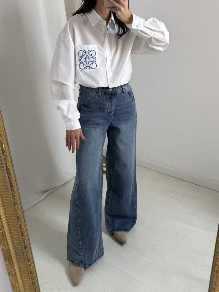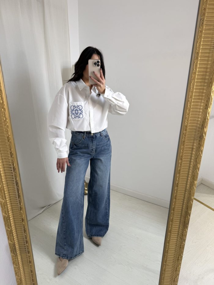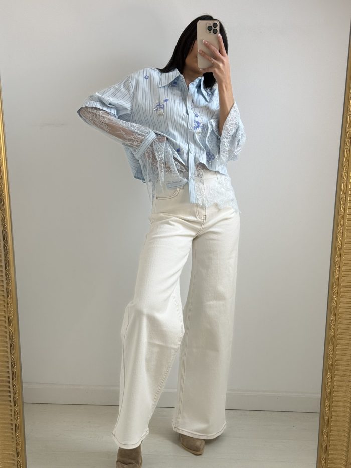Wide Leg Τζιν Λευκό Παντελόνι με Strass Ψηλόμεσο
