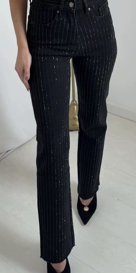 Γυναικείο Τζιν Καμπάνα Μαύρο Ψηλόμεσο με Στρας – Elegant & Chic
