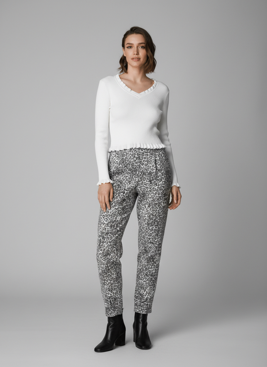 Κομψή και διαχρονική μπλούζα rib σε λευκή απόχρωση, ιδανική για κάθε στιγμή της ημέρας. Διαθέτει V λαιμόκοψη με διακριτικό διακοσμητικό τελείωμα και ελαφρύ βολάν στο τελείωμα και στα μανίκια, που προσθέτει μια θηλυκή πινελιά. Η εφαρμογή της αγκαλιάζει το σώμα χωρίς να περιορίζει την κίνηση, προσφέροντας άνεση και στυλ.