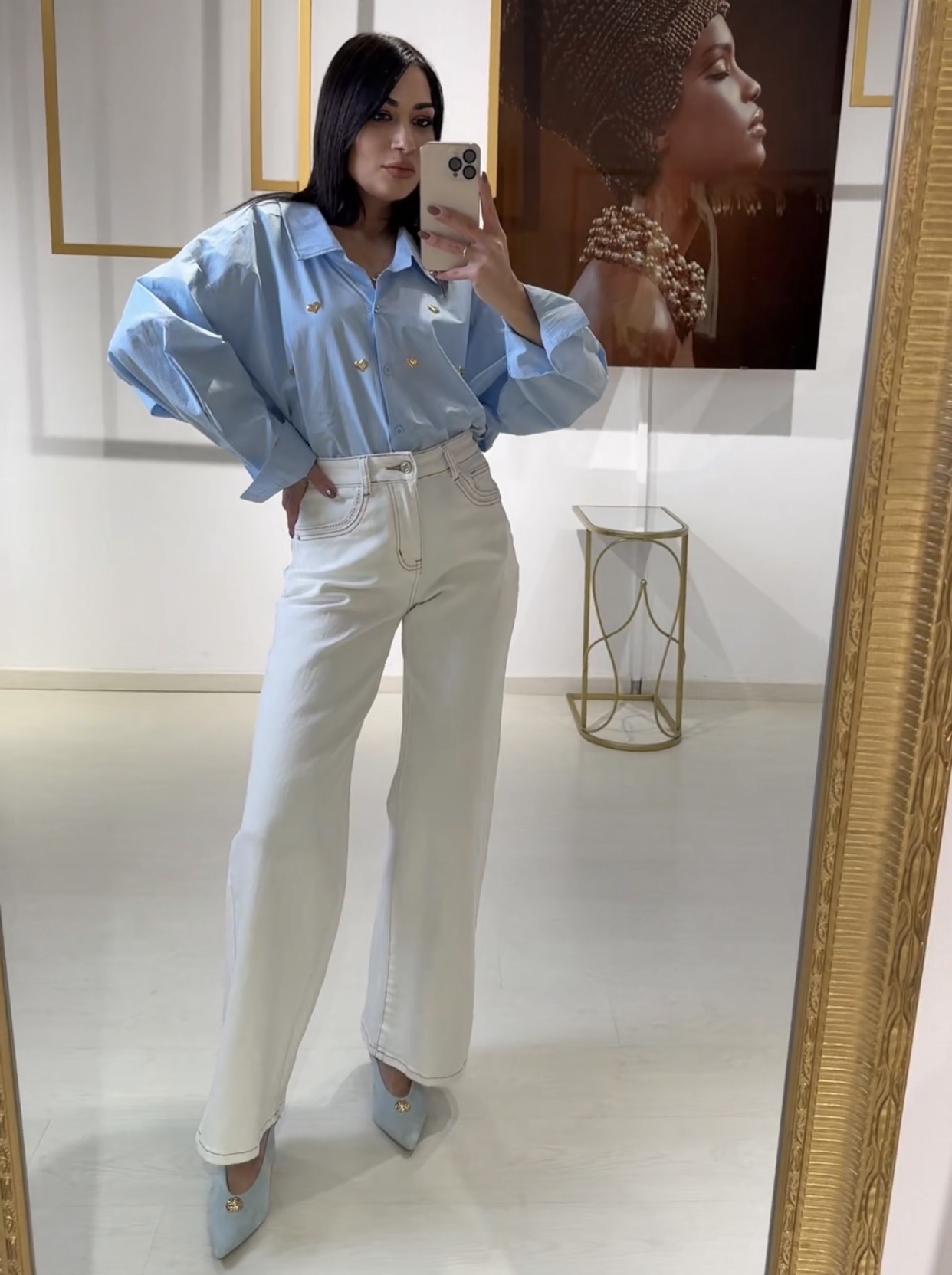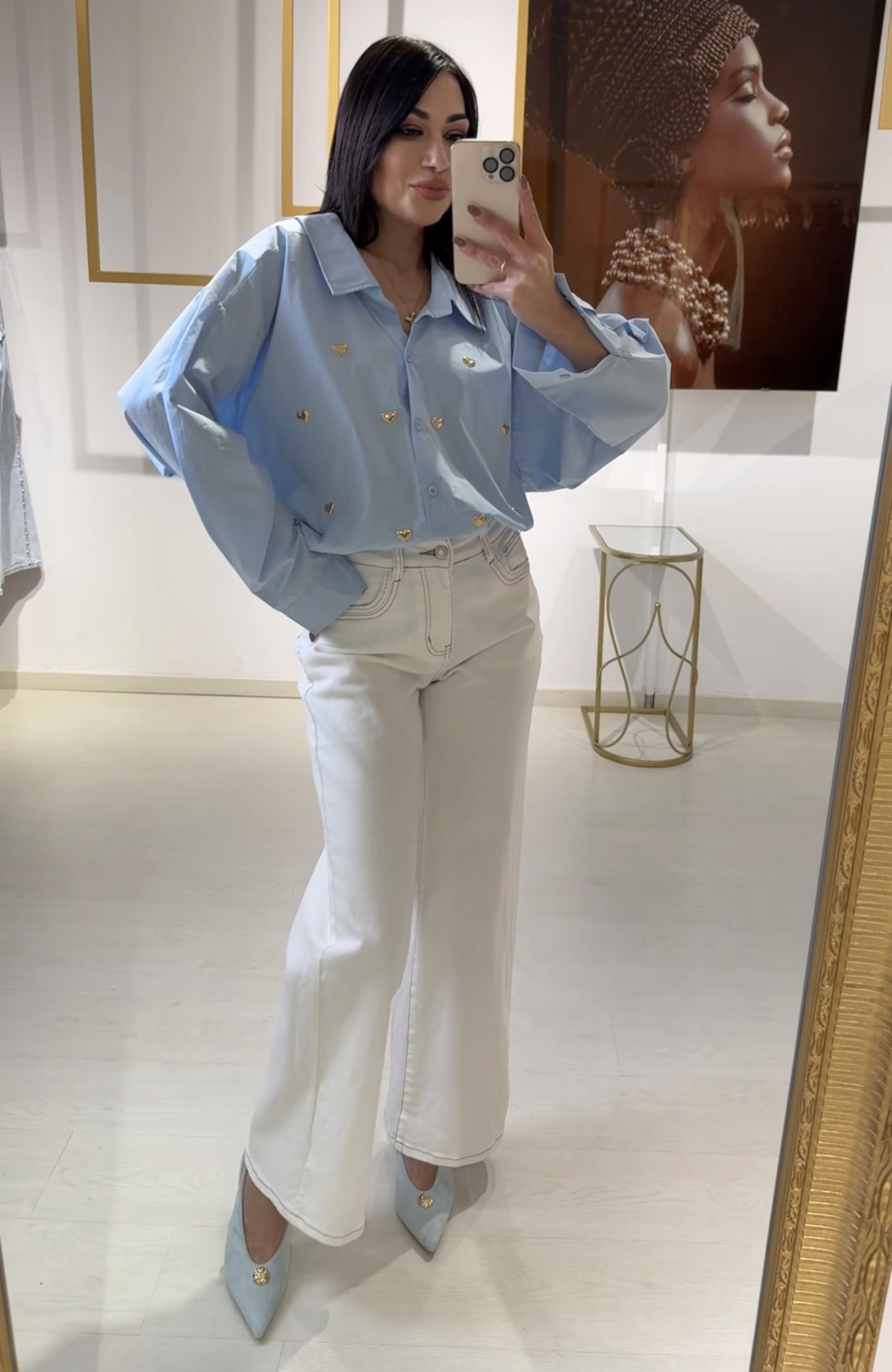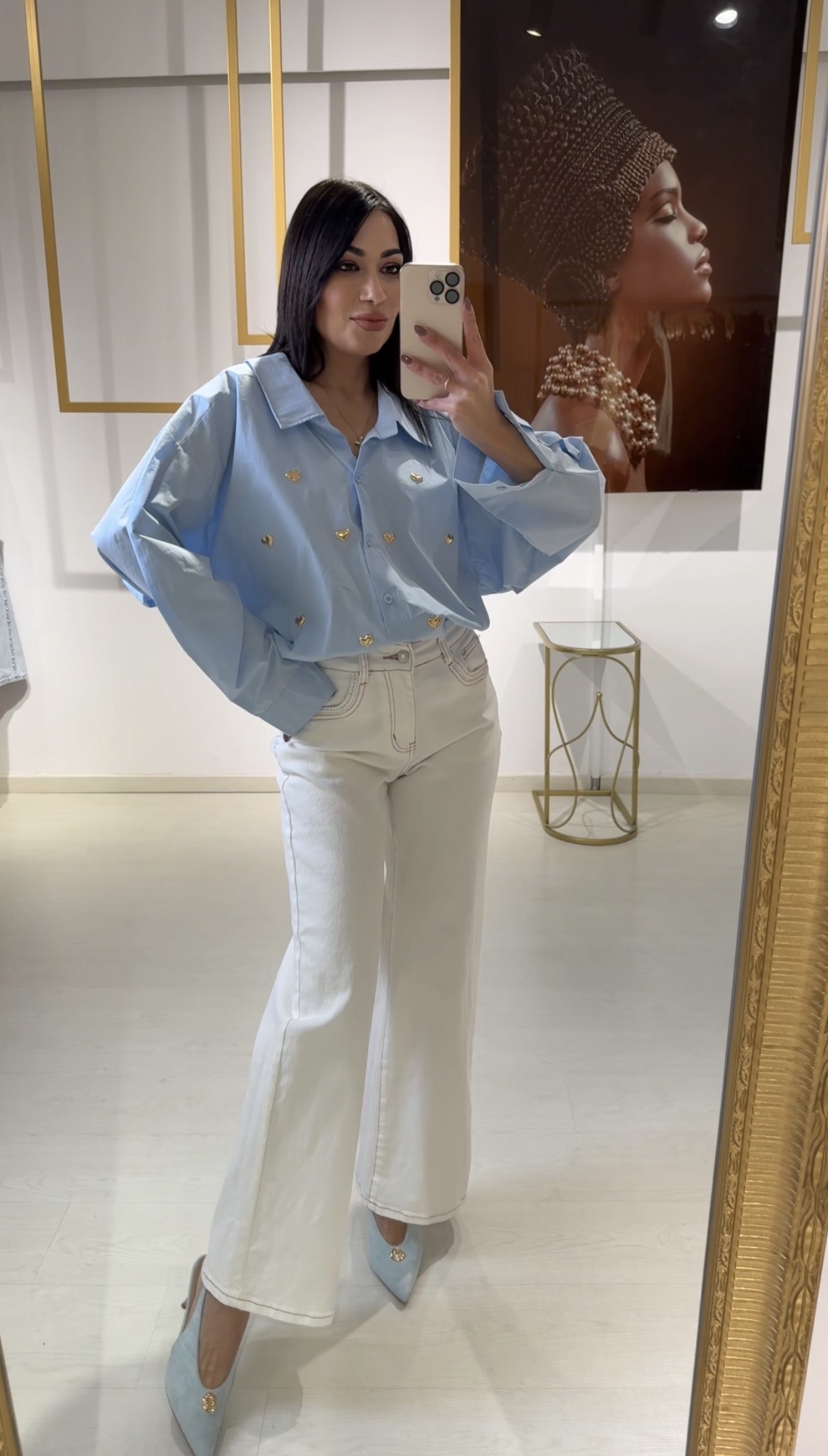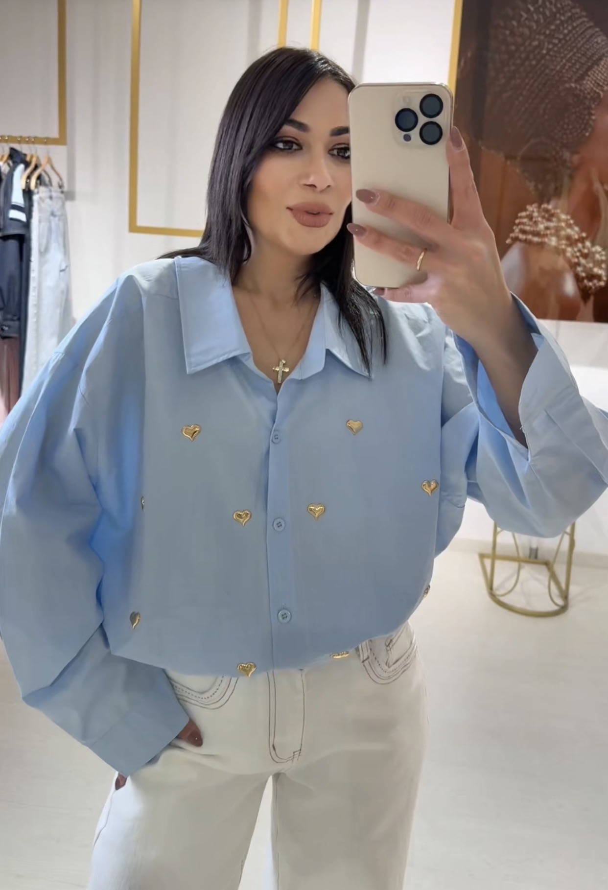 Αναβάθμισε το καθημερινό σου στυλ με αυτό το κομψό γυναικείο πουκάμισο σε oversized γραμμή. Σε απαλή γαλάζια απόχρωση, διακοσμημένο με διακριτικές χρυσές καρδιές, αποτελεί την ιδανική επιλογή για chic & effortless εμφανίσεις από το πρωί έως το βράδυ.