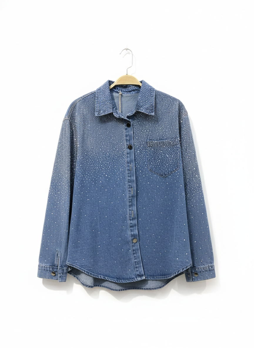Γυναικείο Τζιν Πουκάμισο με Strass – Denim Πουκάμισο με Γιακά & Τσέπη Περιγραφή Προϊόντος (για eShop): Αναβάθμισε το καθημερινό σου στυλ με αυτό το εντυπωσιακό γυναικείο τζιν πουκάμισο με λαμπερά strass. Κατασκευασμένο από ποιοτικό denim ύφασμα, συνδυάζει άνεση και κομψότητα, προσθέτοντας μια διακριτική λάμψη σε κάθε σου εμφάνιση. Διαθέτει κλασικό γιακά, κουμπιά σε όλο το μήκος και μπροστινή τσέπη στο στήθος, ενώ η απαλή γραμμή του αγκαλιάζει το σώμα χωρίς να περιορίζει την κίνηση. Τα διακριτικά strass είναι τοποθετημένα σε όλη την επιφάνεια, δημιουργώντας ένα μοντέρνο και θηλυκό αποτέλεσμα που ξεχωρίζει. Ιδανικό για casual chic σύνολα, μπορεί να φορεθεί:
