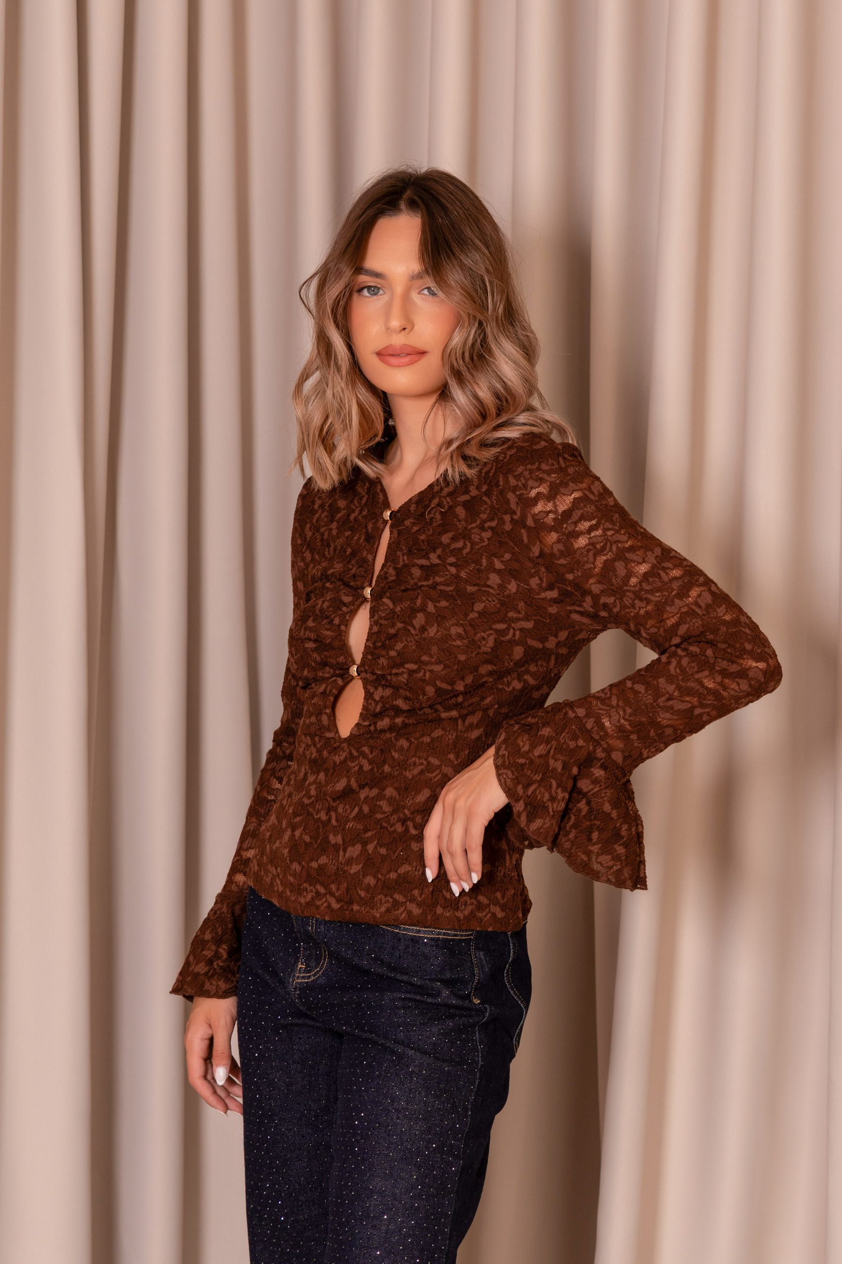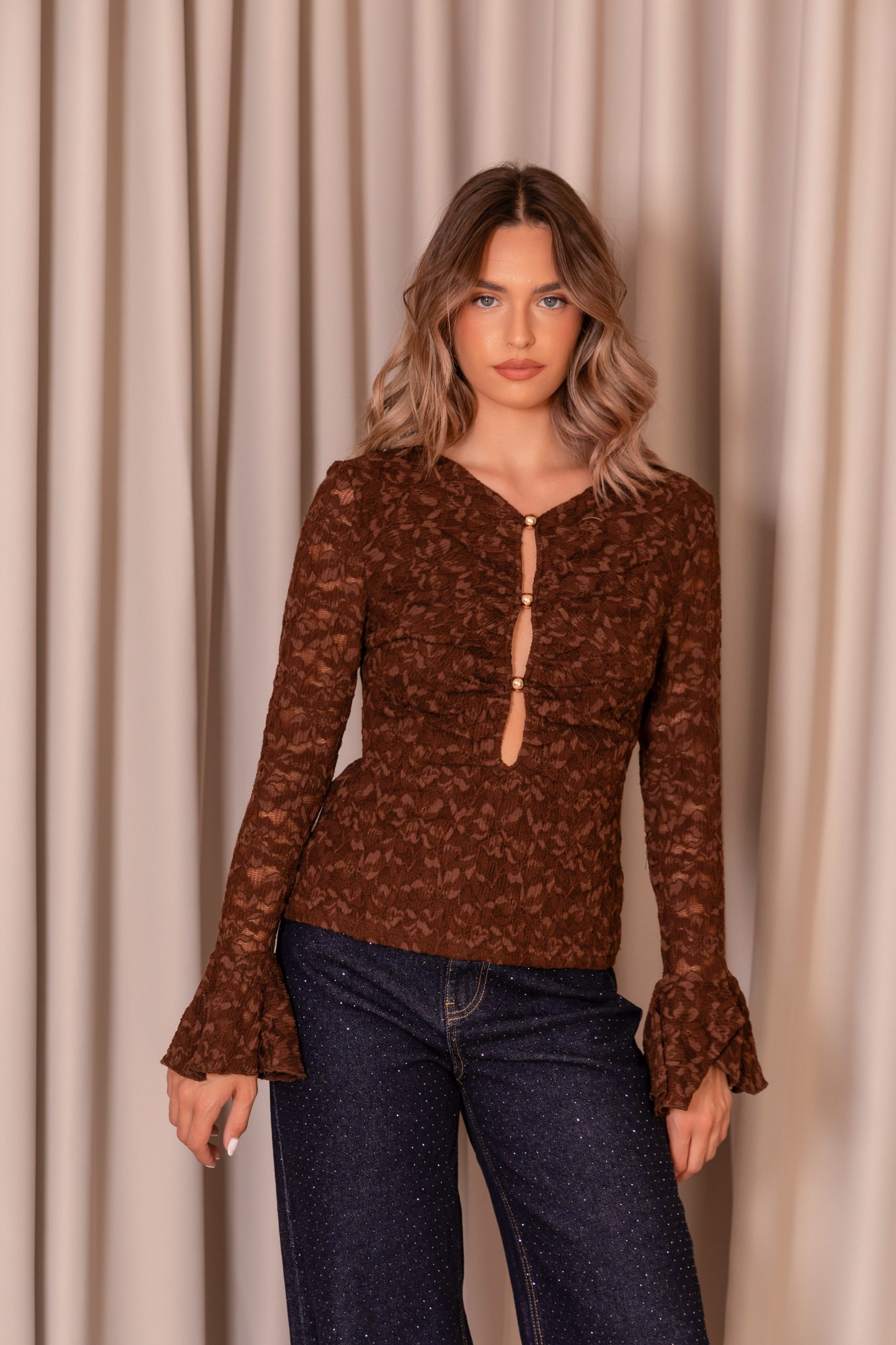 Τοπ BURGUNDY με V λαιμόκοψη και άνοιγμα από δαντέλα με χρυσές λεπτομέριες και βολάν και μανίκια τύπου καμπάνα.
