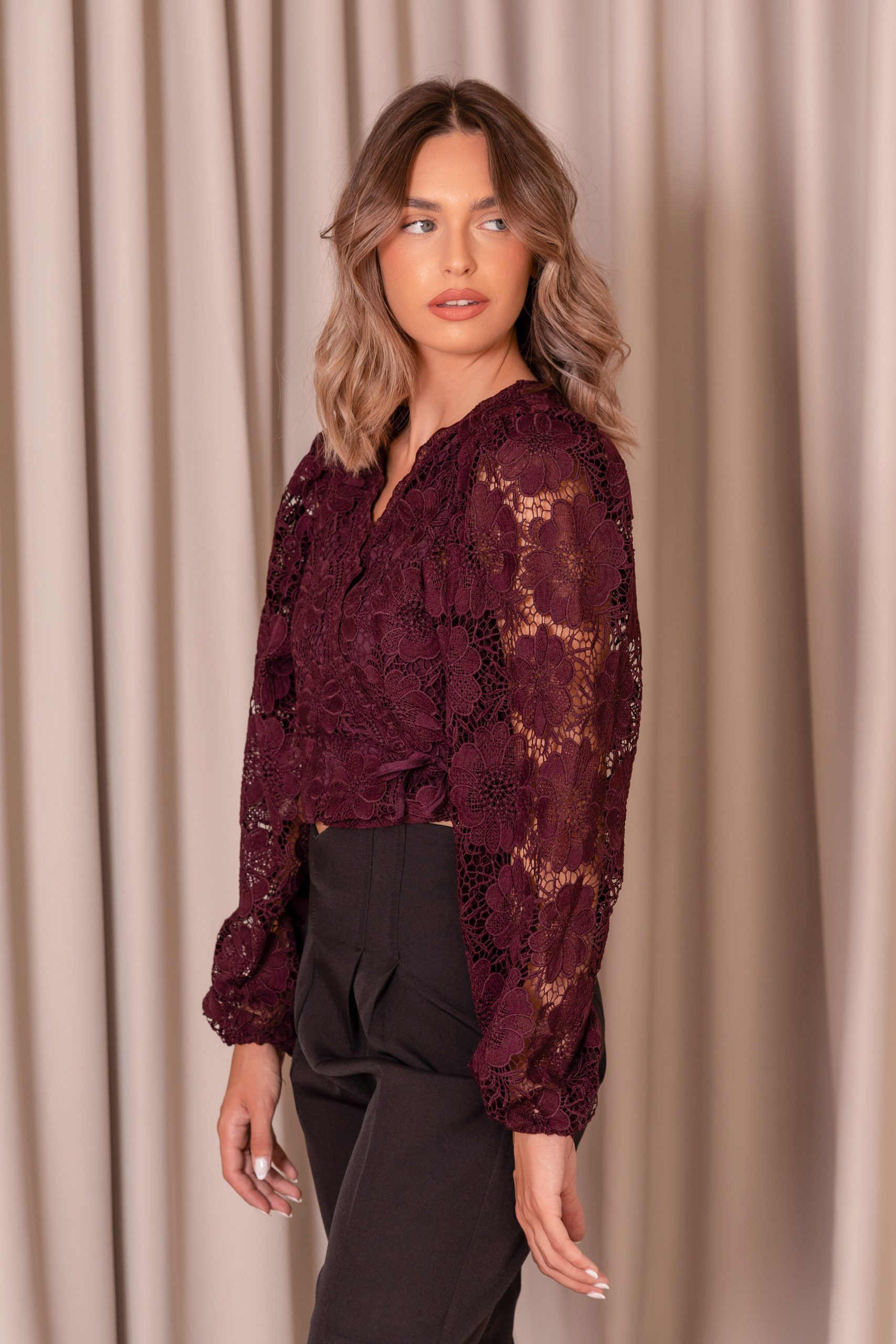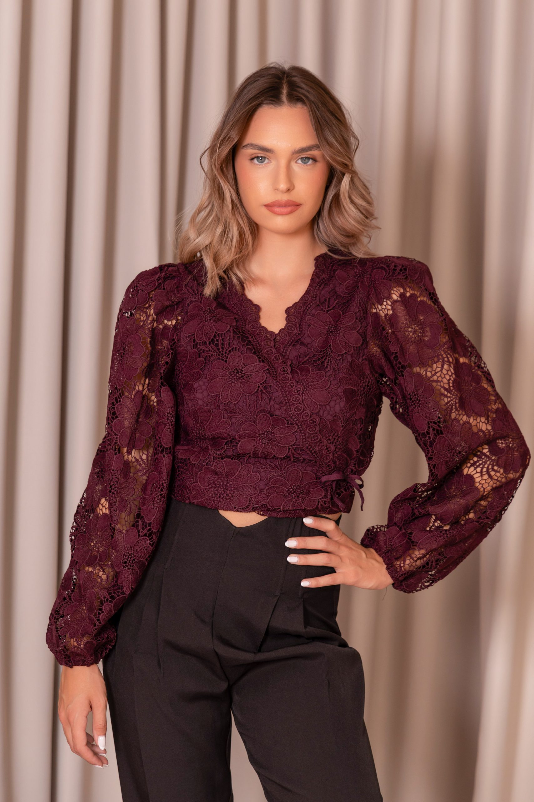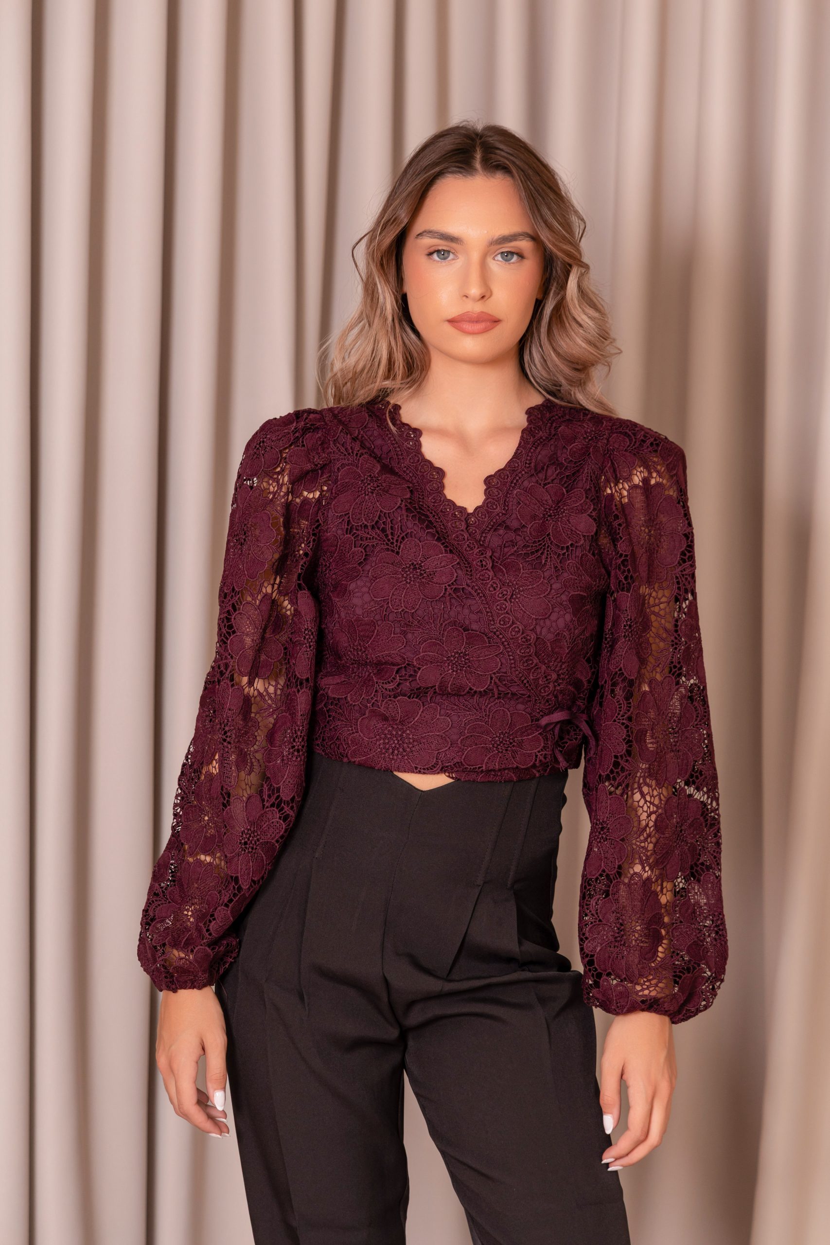 Αναδείξτε το στυλ σας με αυτή τη ρομαντική μπλούζα από φίνα δαντέλα σε βαθύ βουργουνδί χρώμα. Διαθέτει κεντητό floral μοτίβο, V ντεκολτέ με διακριτικό τελείωμα και μακριά balloon μανίκια που χαρίζουν κομψότητα και θηλυκότητα. Η περιμετρική δέση στη μέση τονίζει τη σιλουέτα, ενώ η ελαφρώς cropped γραμμή συνδυάζεται ιδανικά με ψηλόμεσα παντελόνια ή φούστες.