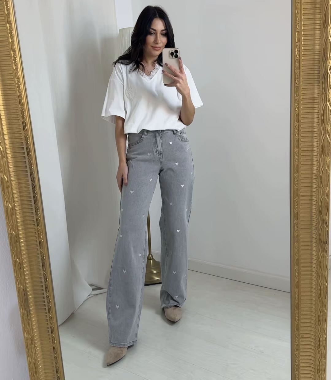 Αναβάθμισε το καθημερινό σου look με αυτό το μοναδικό τζιν διακοσμημένο με παιχνιδιάρικες καρδούλες! Ένα κομμάτι που συνδυάζει άνεση και στυλ, ιδανικό για να δώσεις μια girly και μοντέρνα πινελιά σε κάθε σου εμφάνιση.