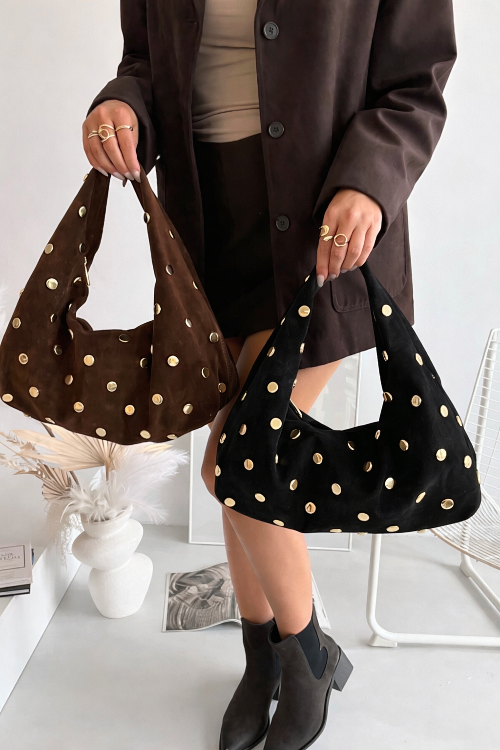 Γυναικεία Τσάντα Ώμου σε Μαύρο Σουέτ με Χρυσά Τρουκς Εντυπωσιακή και απόλυτα fashion-forward τσάντα ώμου, ιδανική για να αναβαθμίσει κάθε εμφάνιση. Κατασκευασμένη από απαλό συνθετικό σουέτ σε ζεστή καφέ απόχρωση, διακοσμημένη με μεταλλικά χρυσά τρουκς που προσθέτουν χαρακτήρα και statement αισθητική. Χαρακτηριστικά: