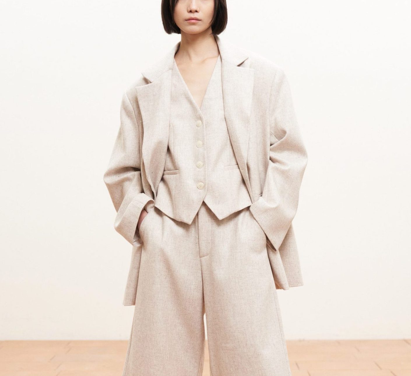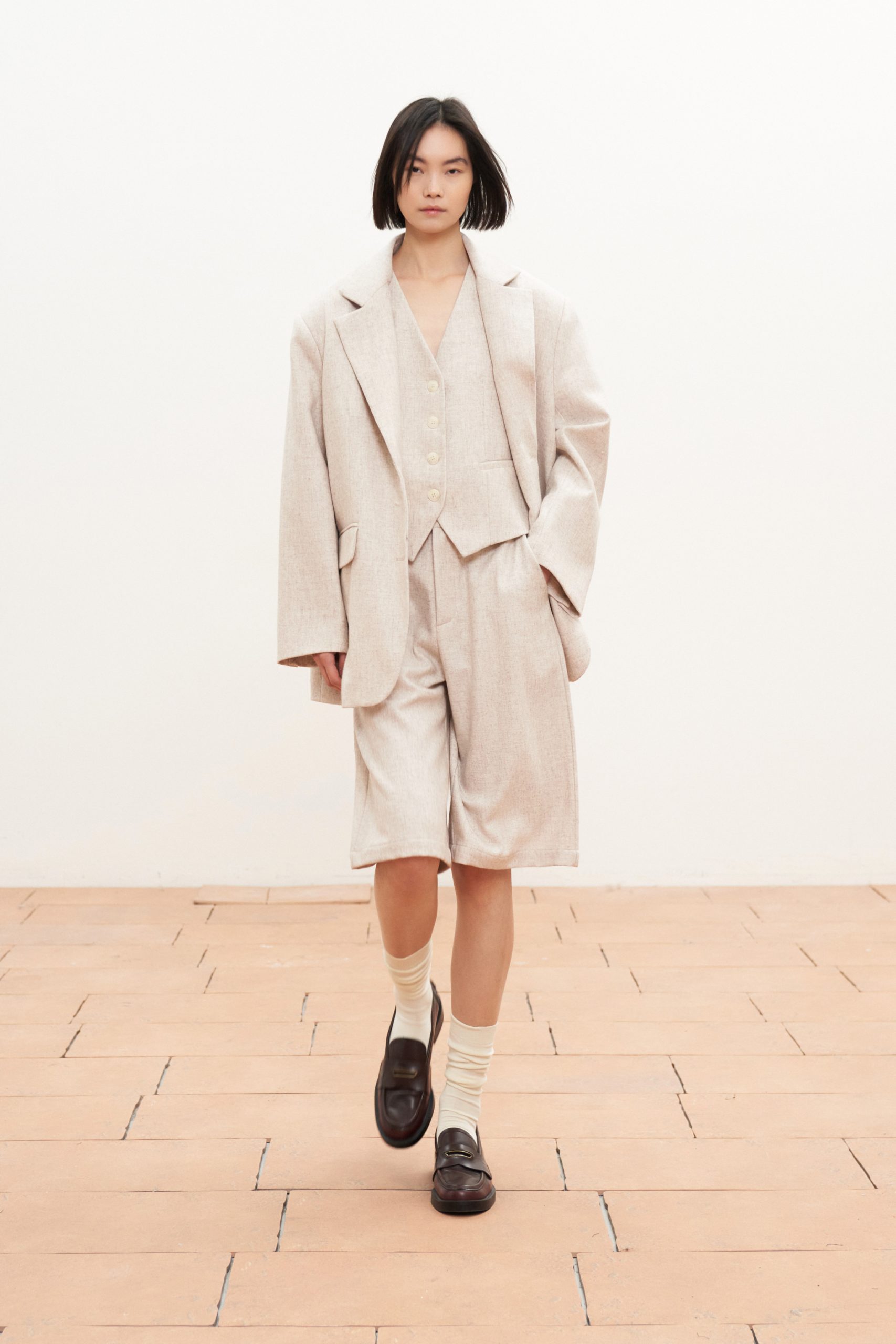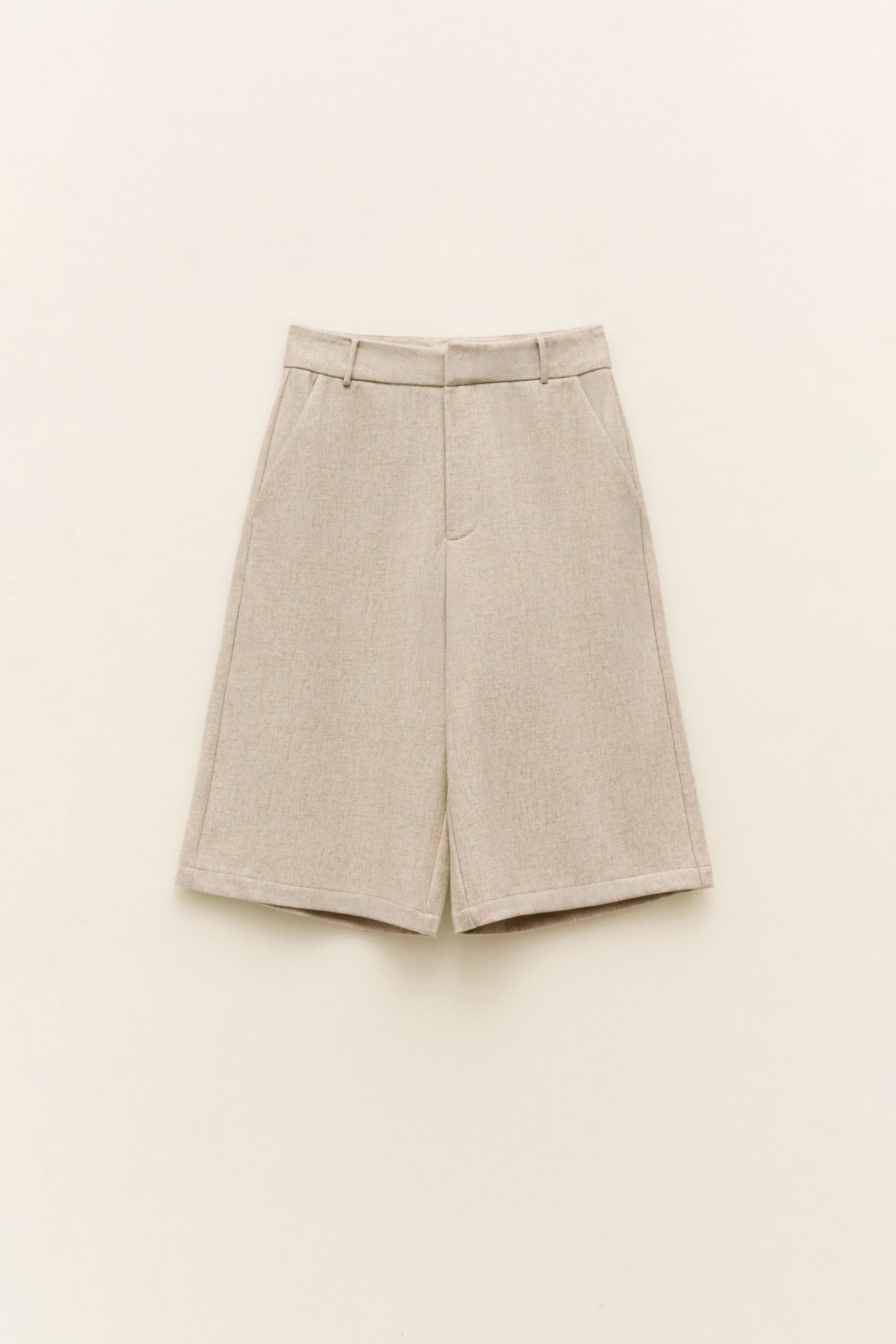 Βερμούδες από μείγμα μαλλιού. Μπροστινές τσέπες και θηλιές ζώνης στη μέση. Κλείσιμο με φερμουάρ και γάντζο μπροστά. Κανονική εφαρμογή, διαθέσιμο σε μέγεθος S/M/L.