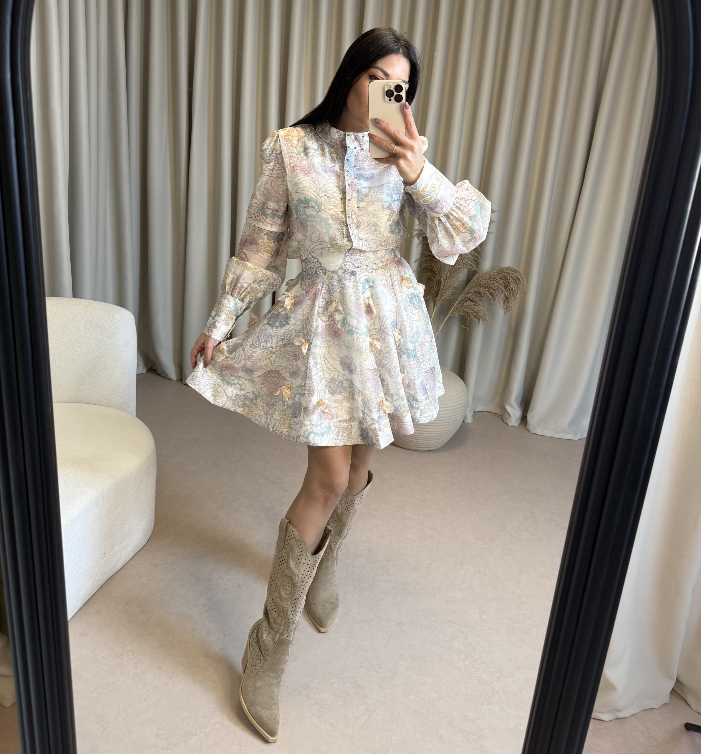 Αέρινο mini φόρεμα σε παστέλ αποχρώσεις με ρομαντικό print και εντυπωσιακά μανίκια που χαρίζουν κομψότητα και θηλυκότητα. Η εφαρμογή τονίζει τη μέση ενώ η φούστα ανοίγει απαλά για girly κίνηση. Συνδυάζεται τέλεια με western μπότες για fashion-forward εμφανίσεις από το πρωί μέχρι το βράδυ.