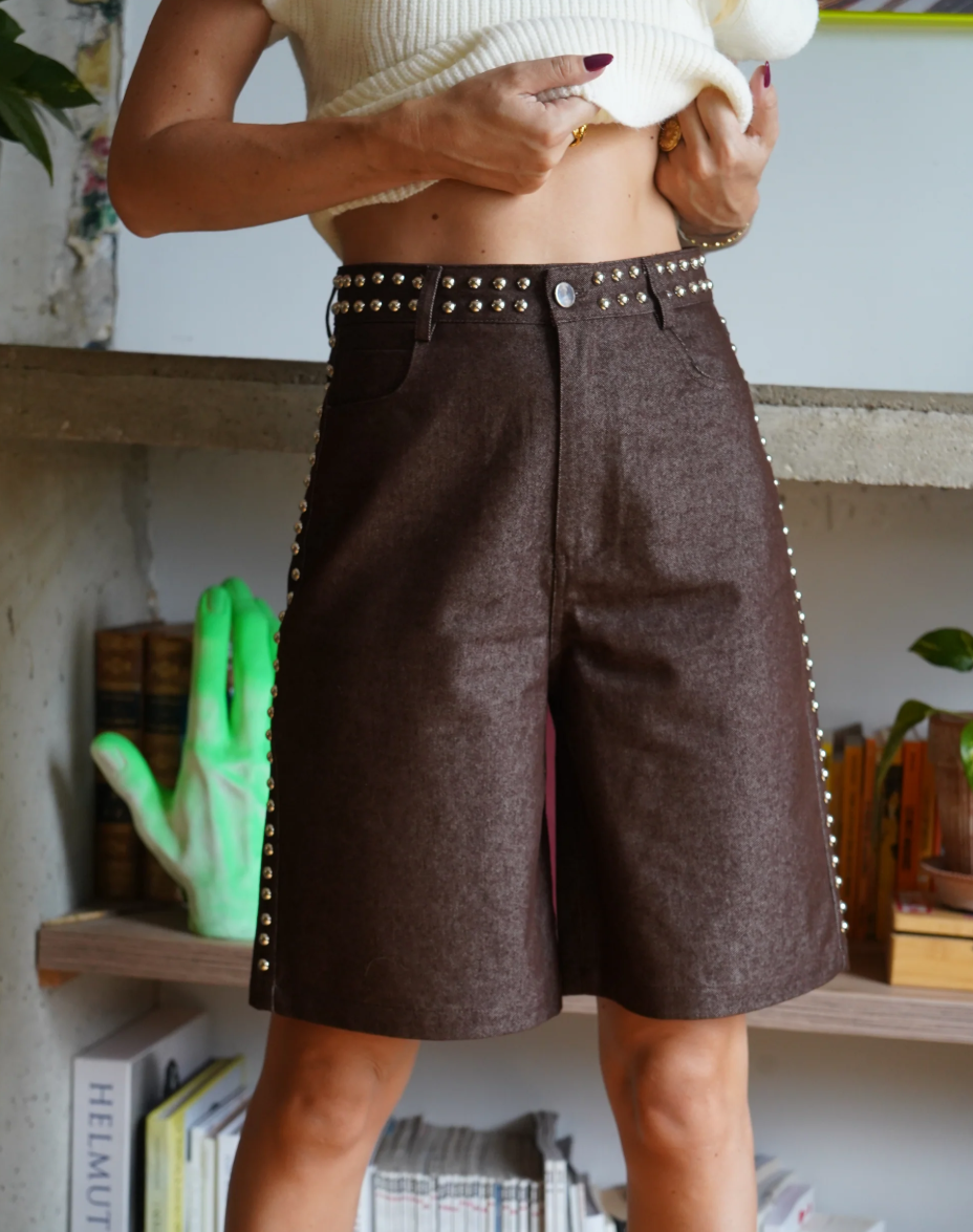 Γυναικείο σορτς με μοντέρνο και δυναμικό χαρακτήρα, ιδανικό για ξεχωριστές εμφανίσεις από το πρωί έως το βράδυ. Διαθέτει ψηλόμεση γραμμή που αναδεικνύει τη σιλουέτα, ενώ το structured ύφασμα προσφέρει άνεση και σταθερή εφαρμογή. Οι διακοσμητικές μεταλλικές λεπτομέρειες (studs) στη μέση και στα πλαϊνά χαρίζουν rock αισθητική και κάνουν το κομμάτι να ξεχωρίζει. Κλείνει με κουμπί και φερμουάρ στο μπροστινό μέρος, ενώ οι πρακτικές τσέπες προσθέτουν λειτουργικότητα. Συνδύασέ το με crop top ή πουκάμισο για ένα statement look που τραβά τα βλέμματα.