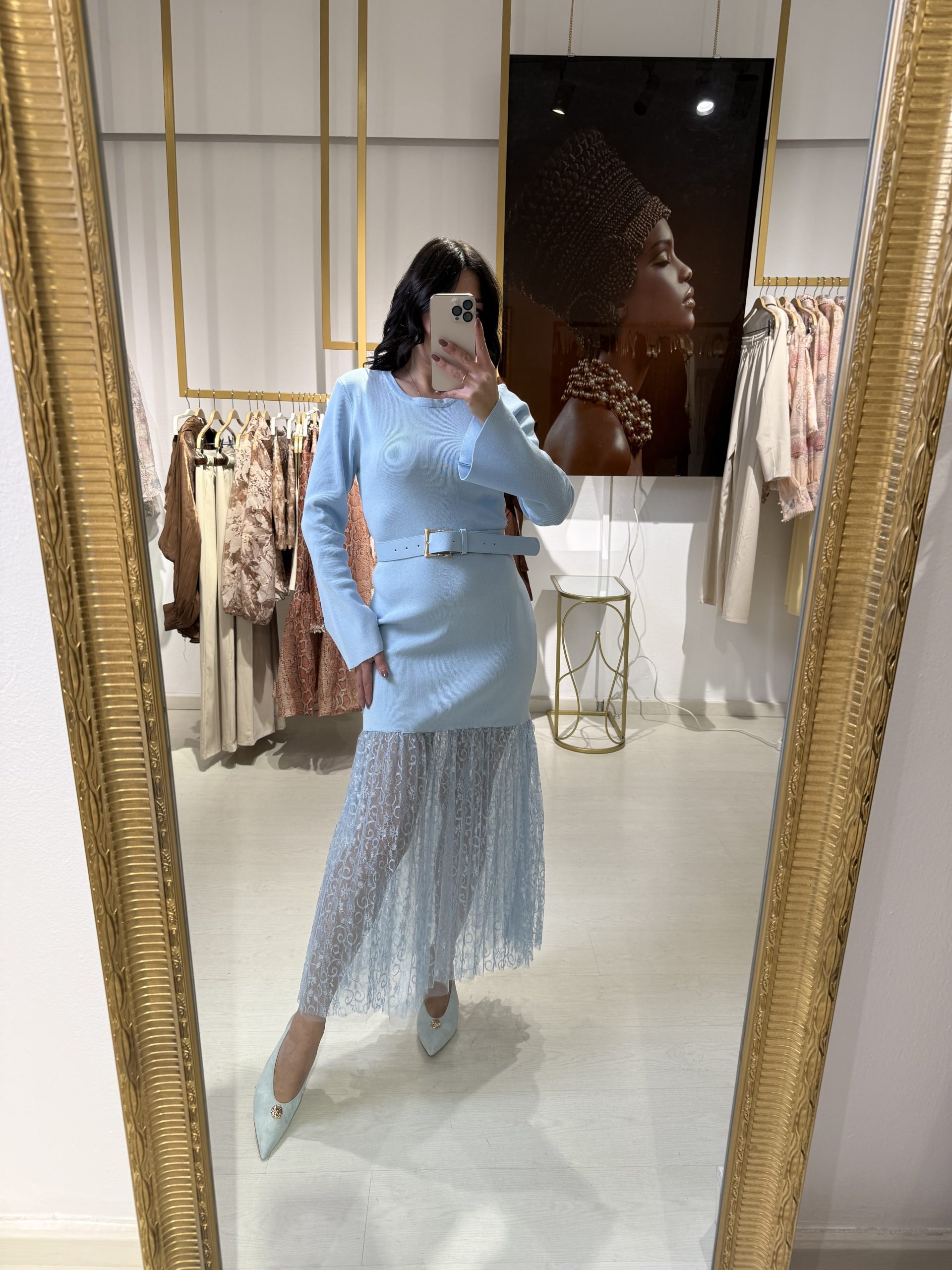 Ανακάλυψε το απόλυτα κομψό midi γαλάζιο φόρεμα που συνδυάζει minimal γραμμή με ρομαντικές λεπτομέρειες. Το πλεκτό εφαρμοστό επάνω μέρος αγκαλιάζει τη σιλουέτα, ενώ το δαντελένιο τελείωμα στο κάτω μέρος προσθέτει θηλυκότητα και κίνηση σε κάθε σου βήμα. Διαθέτει μακριά μανίκια, στρογγυλή λαιμόκοψη και αποσπώμενη ζώνη στη μέση για τέλεια εφαρμογή.