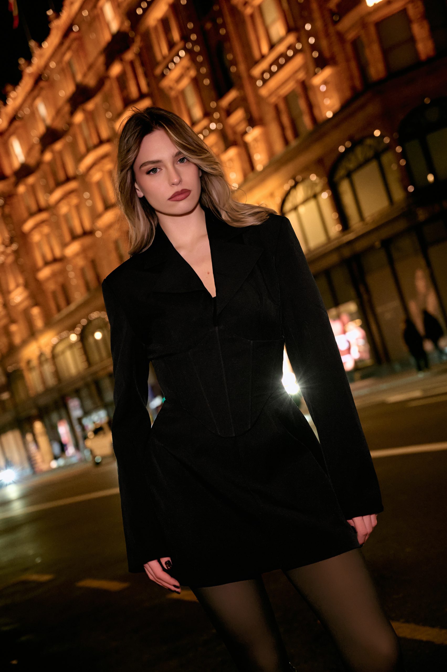 Αναδείξτε τη δυναμική και κομψή σας πλευρά με αυτό το εντυπωσιακό mini φόρεμα-σακάκι σε μαύρο χρώμα. Συνδυάζει τη δομημένη γραμμή ενός tailored blazer με την εφαρμογή κορσέ, δημιουργώντας μια άψογη hourglass σιλουέτα.